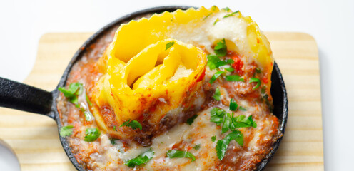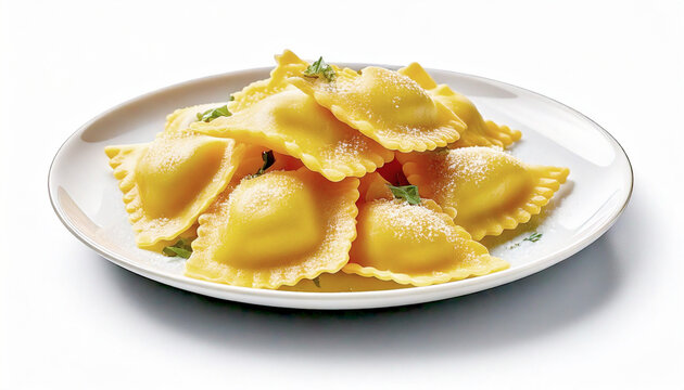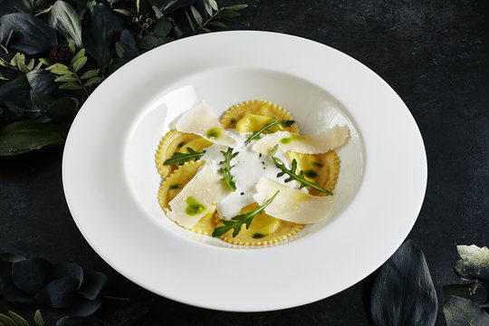 Italian food, handmade mezzaluna pasta ravioli stuffed with four cheeses