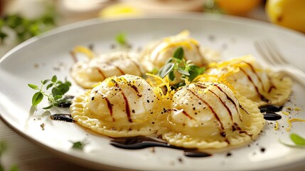 White Restaurant Plate of Ravioli 4 Cheeses with Cheese Espoume