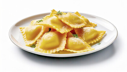 White plate with four cheese ravioli and fresh basil garnish. Perfect for Italian restaurant menus, cooking blogs, and authentic food photography