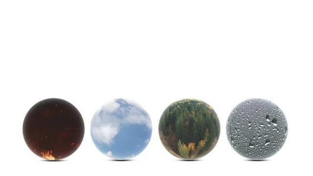 Fire, air, earth and water four elements spheres isolated on white animation background with copy space.