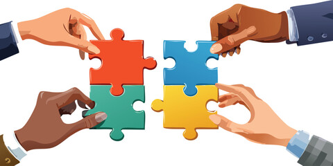 Four puzzle pieces coming together in the hands of different people, symbolizing collaboration, partnership, and business solutions.