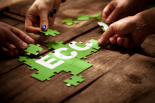 Friends joining ECO word with green jigsaw pieces on table