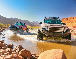Pickup truck riding in desert river with rocks around, expedition, sunny day, water splashes