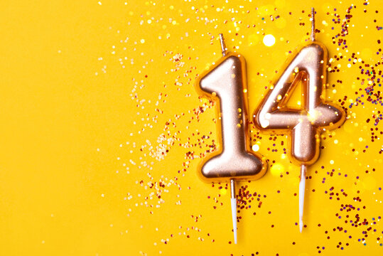 Gold candles in the form of number fourteen on yellow background with confetti. 14 years celebration.