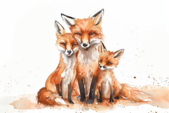 A watercolor painting of a mother fox and two kits sitting together. Children's Book Illustration