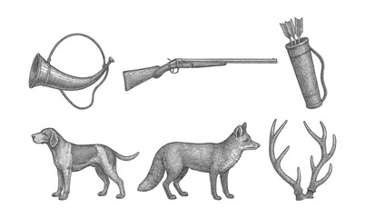 Vintage hunting equipment and wildlife engravings: horn, rifle, quiver, dog, fox, antlers