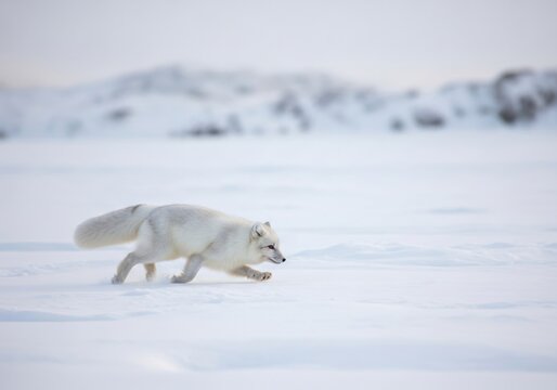 Arctic fox hunting in snowy tundra