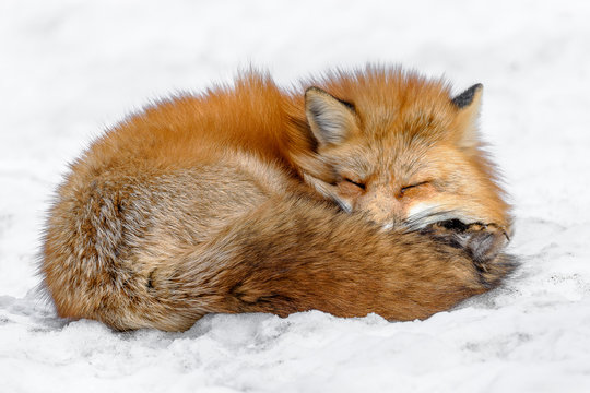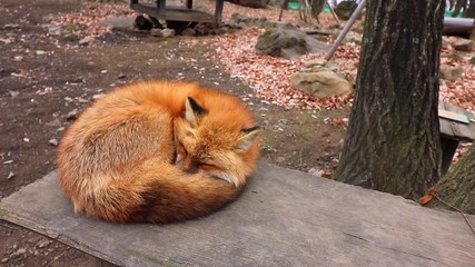 Japanese red fox kitsune curled up sleeping at Zao Fox Village, Miyagi Japan