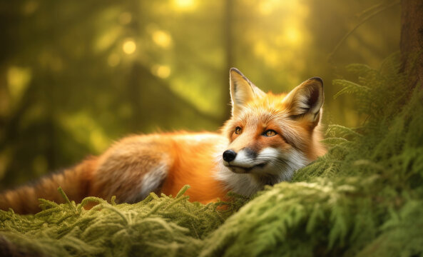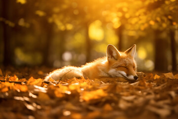 sleeping fox in a pile of leaves in the autumn sun, generative ai