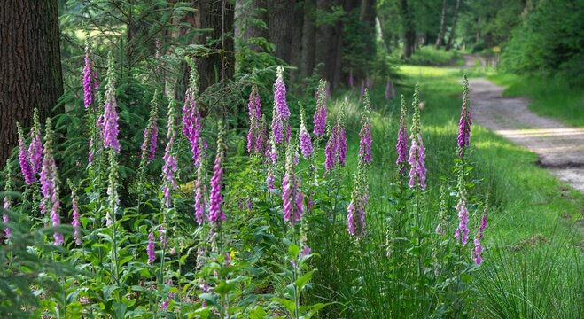Close up of the beautiful but toxic blossoms of foxglove (Digitalis purpurea) plants, blooming purple and pink. Common foxglove is a species of flowering plant in the plantain family Plantaginaceae.