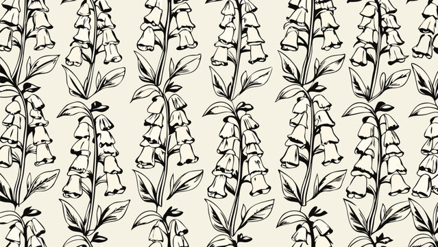 Monochrome botanical pattern featuring foxglove flowers and foliage in a repeating arrangement style design