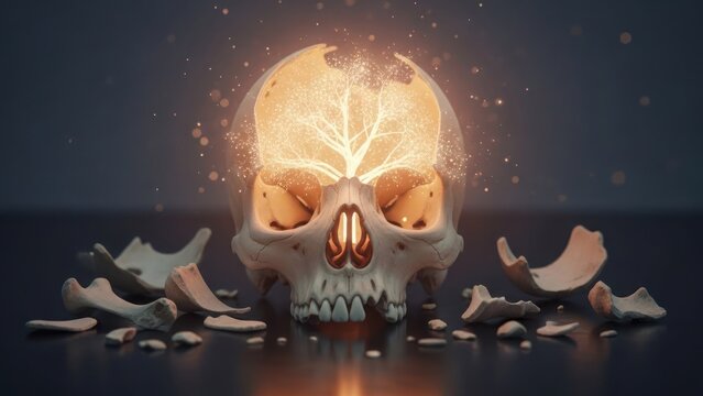 Skull fragments with glowing tree inside head and floating particles, dark background