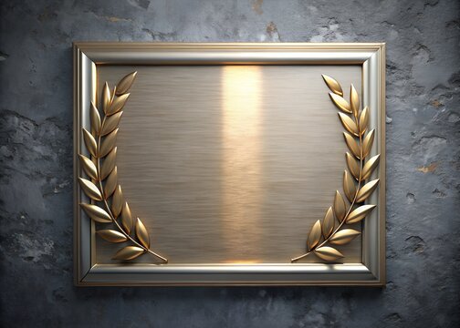 Gilded Laurel Wreath Plaque: A close-up of a decorative plaque with an antique gold finish, framed with a gilded laurel wreath and set against a textured background