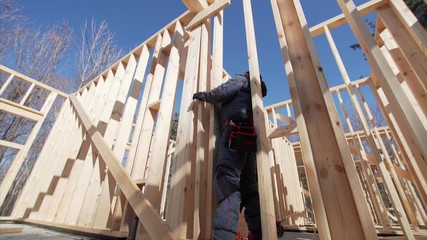 Sliding view from below of framer adjusting beams at frame house building. Sunny day