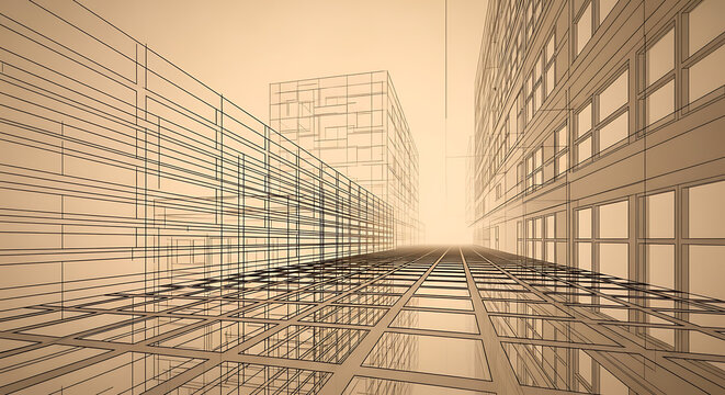 Architectural blueprint perspective of a city street, showing building frameworks and gridlines.