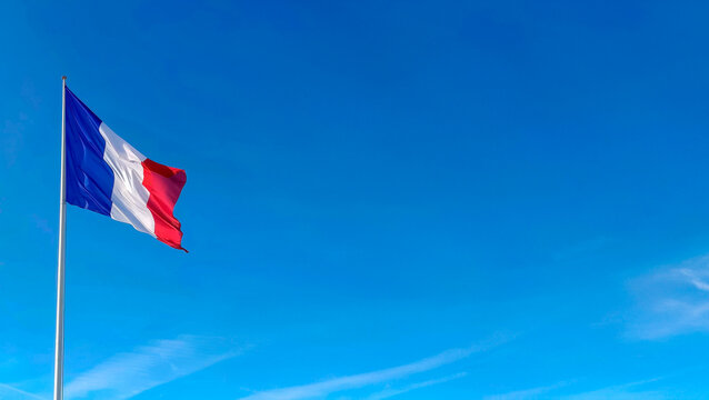 The French flag is fluttering in the wind against the clear blue sky. Copy space for text