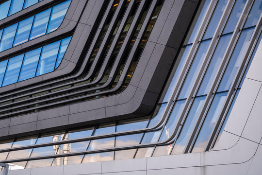 Modern and unusual architecture from metal and glass. Non-standard forms and decisions. Lines and geometry of the big building.