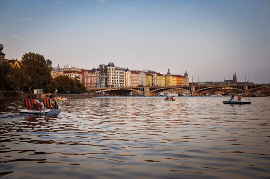 modern architecture dancing house of medieval Prague view from the surface of the vltava