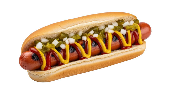 Delicious hot dog with mustard, ketchup and relish isolated PNG with Transparent Background
