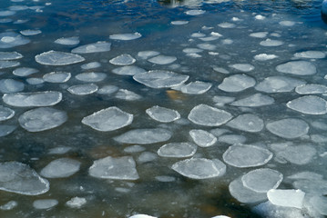 Round ice discs drifting on the river as freezing sets in, surrounded by winter trees and snowy landscape