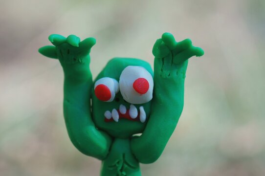 The zombie figurine is trying to scare. Funny monster made of plasticine.
