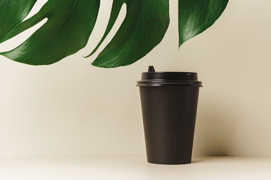 Disposable paper coffee cup and green leaf. Ecology concept