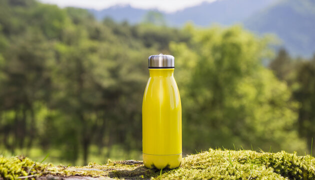 Sustainable yellow metal thermos for drinks. Camping or hiking equipment. Zero waste, plastic free