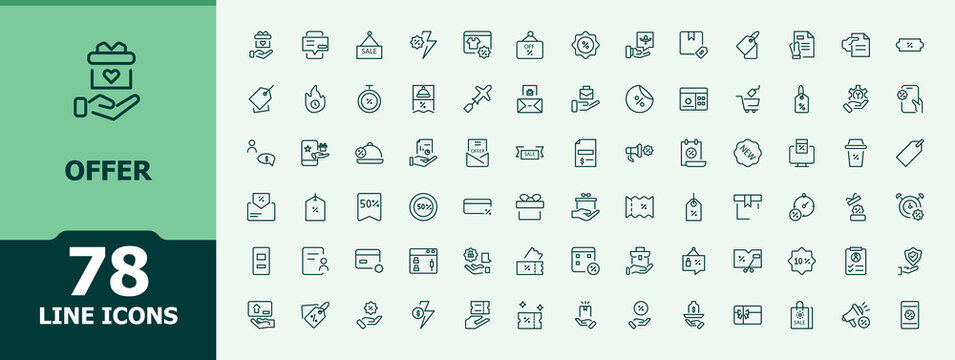 Offer line icon set. Includes symbols for coupon, present, shopping, gift, surprise and more. Minimalist icons collection. Present line icon set. Editable stroke. Vector illustration.