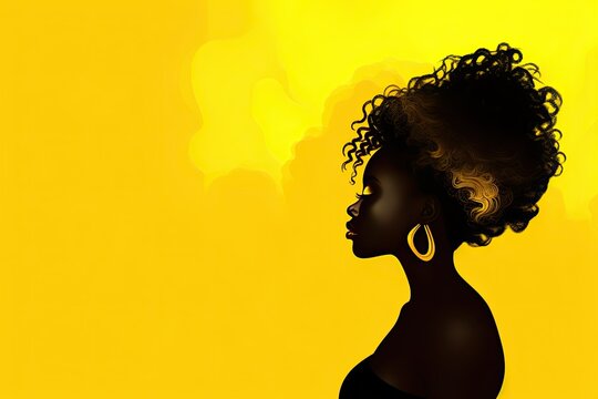 Portrait in profile of an African American girl with a lush hairstyle on a yellow background. Free space for product placement or promotional text.