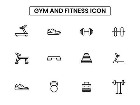 Gym and fitness icon set. Containing healthy lifestyle, weight training, body care and workout or exercise equipment icons. Solid icons vector collection