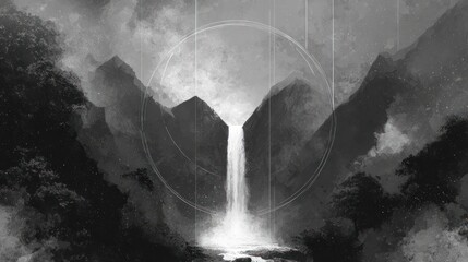 Dramatic grayscale landscape art featuring waterfall mountains and ambient light effects