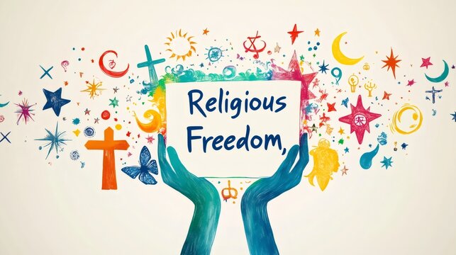 interfaith tolerance, open hands hold a scroll saying religious freedom, surrounded by diverse symbols like the cross, crescent, star of david, om, symbolizing acceptance and freedom