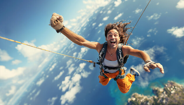 Man's thrill bungee jumping from hot-air balloon captures excitement, adventure, and adrenaline. With joyful expression, he embraces freefalling, embodying bravery, fearlessness in daring activity