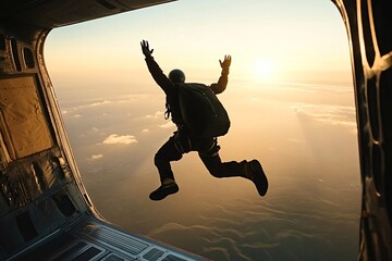 Silhouette of parachutist jumping from an airplane at sunset, experiencing the thrill of freefall above a beautiful landscape