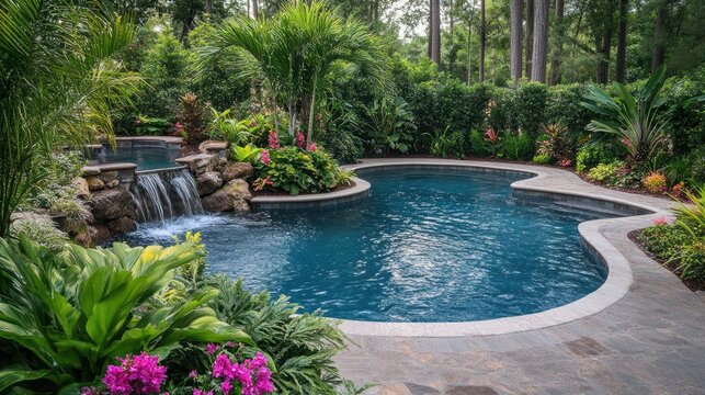 Luxurious freeform pool with waterfall and lush tropical landscaping in a backyard oasis.