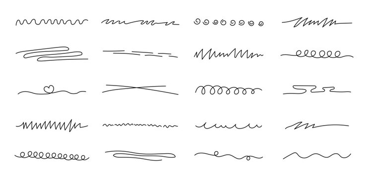 Highlighter underline line doodle set with various hand drawn strokes, flowing curves, curled, abstract waves, freehand contours and decorative design elements