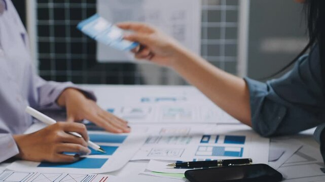 Website designer, Creative planning phone app development template layout framework wireframe design, User experience concept, Young asian woman UX designer working on smartphone application at office