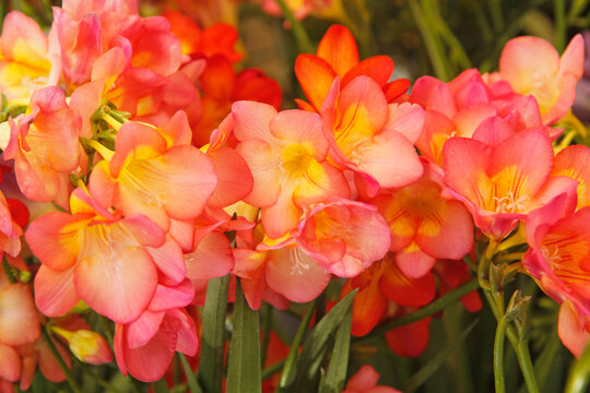 Spring background. Beautiful spring freesia flowers on a white background. Place for text, close-up. Romantic background for spring holidays.