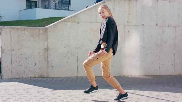 A young girl performs modern hip hop dance on the streets of the city during the summer, twisting and rotating.