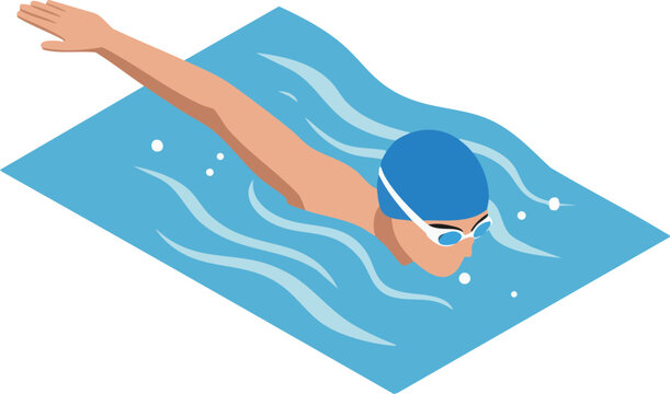 Swimmer in blue swim cap performing freestyle stroke in outdoor pool with water waves vector illustration