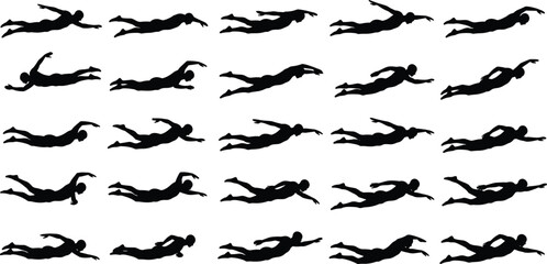 Swimming silhouette collection, swimmer stroke sequence, freestyle, breaststroke, butterfly, crawl, water sport training, aquatic motion study, fitness vector illustration design