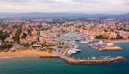 Aerial cityscape of France city Frejus with yachts in the harbor