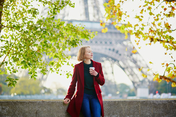 Stylish one young adult caucasian girl in red beret with cup of coffee in parisian street cafe on Eiffel tower background. woman sit in autumn fall in Paris. winter time. breakfast time. Generative ai