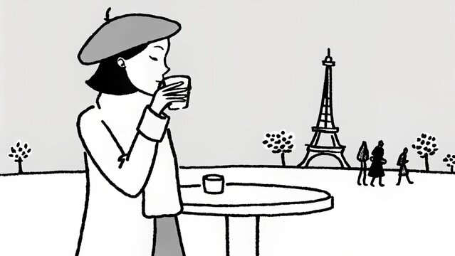 A stylish Parisian woman in a beret and trench coat sips espresso at a charming outdoor café. The Eiffel Tower stands in the background as people walk along streets