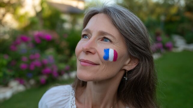 Mature caucasian female with french flag face paint in garden setting