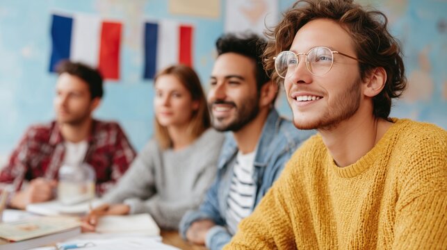 Group of international students engaged in a cheerful language conversation class, sitting around a table with American and French flags, enjoying multicultural learning in a modern classroom.