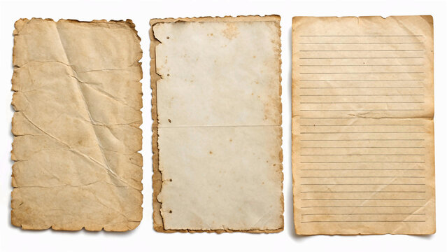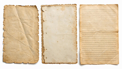 three vintage and antique paper textures, stained g with ripped / torn edges and old French ledger paper isolated on white a background, blank textured sheets as backgrounds or paris, shabby, chic, li