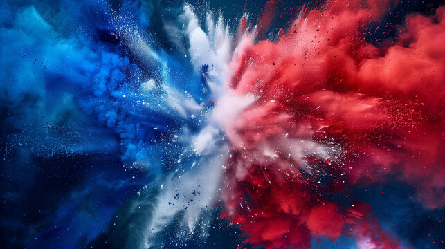 Long table set for a garden party under french flag bunting. Outdoor celebration for Bastille Day, a national holiday, or a large family gathering