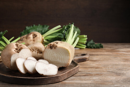 Close-up of fresh beets with leafy green tops resting on a wooden cutting board. The beets display a rich purplish-red hue and slightly rough texture, while the crisp green leaves add contrast and fre