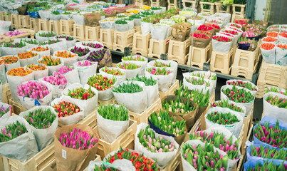 Colourful fresh tulips on sale in flower market, Amsterdam, Netherlands, Europe